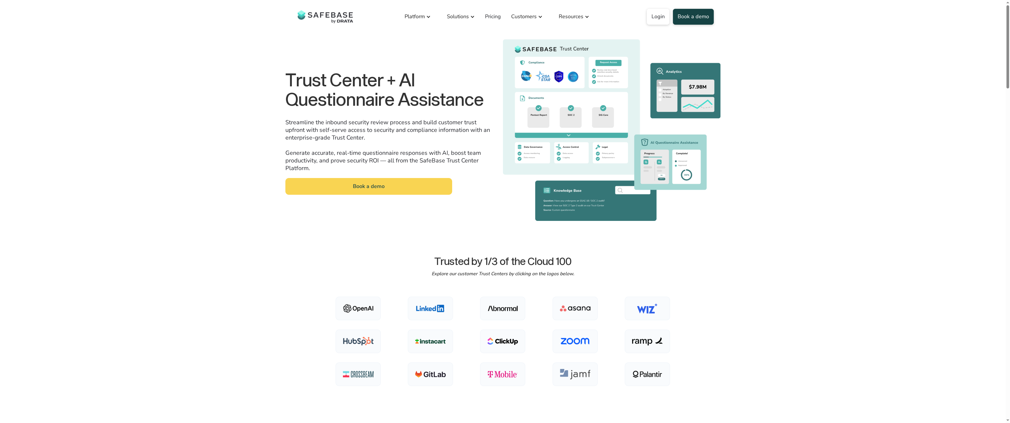 SafeBase by Drata is a trust center platform that centralizes security documentation and automates inbound security reviews with AI help. It’s built to shorten review cycles—claims include up to 80% time savings—and to provide a single, self-serve hub customers can use to verify security posture. For security, sales, and GRC teams, it balances visibility and automation with integrations that embed trust into existing workflows.