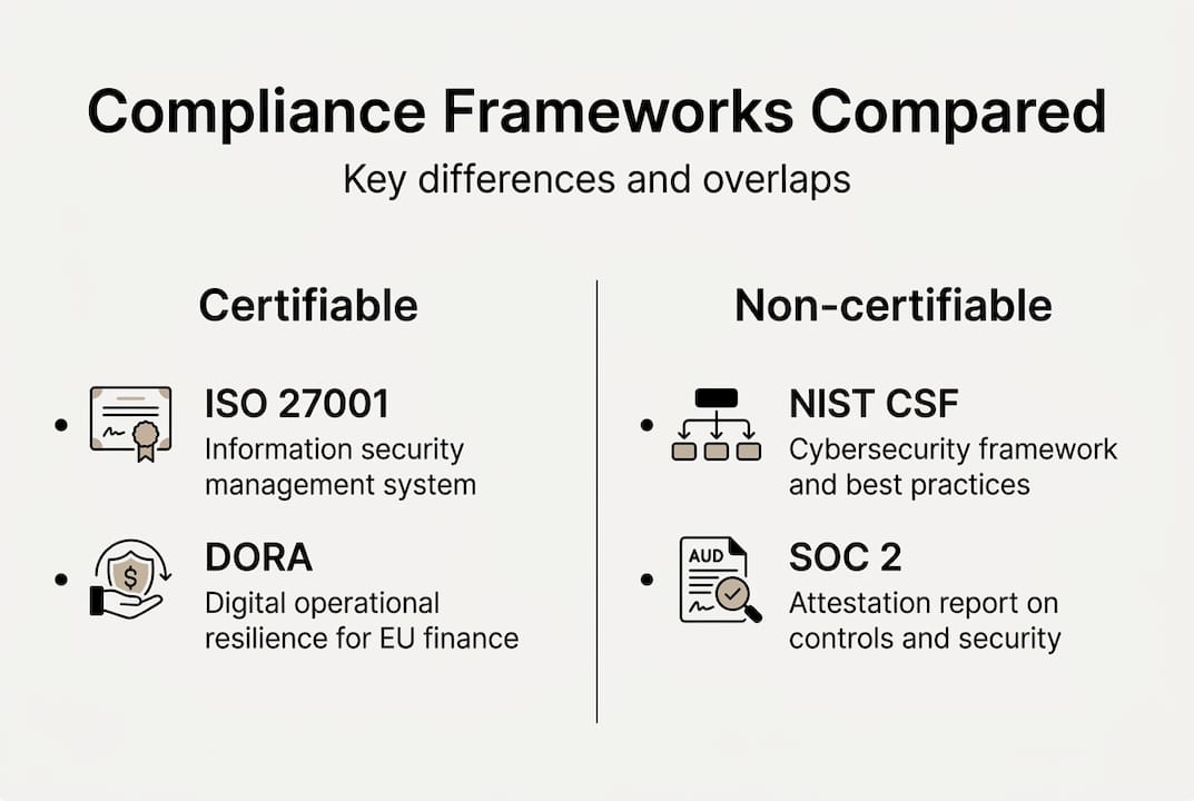 Where frameworks diverge most sharply: NIST is flexible but lacks external comparability since there is no certificate to show clients. ISO is certifiable but resource-intensive. SOC 2 is the SaaS baseline but not a certification. DORA extends well beyond cybersecurity into operational resilience and third-party governance. Knowing these edges prevents scope creep and misaligned effort.