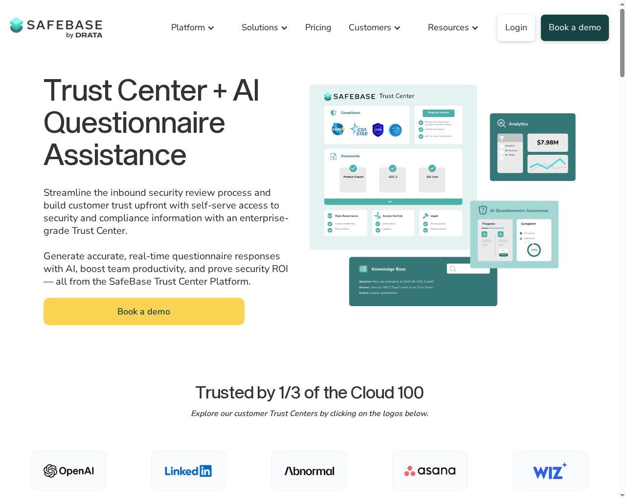 SafeBase by Drata is a trust center platform built to streamline inbound security reviews and accelerate questionnaire responses with AI assistance. It combines self-serve security portals, branded trust centers, and analytics to help security teams demonstrate ROI and reduce repetitive work. For mid-to-large organizations that field frequent security inquiries, SafeBase is a practical option that shifts many manual touchpoints to a searchable, customer-facing experience.