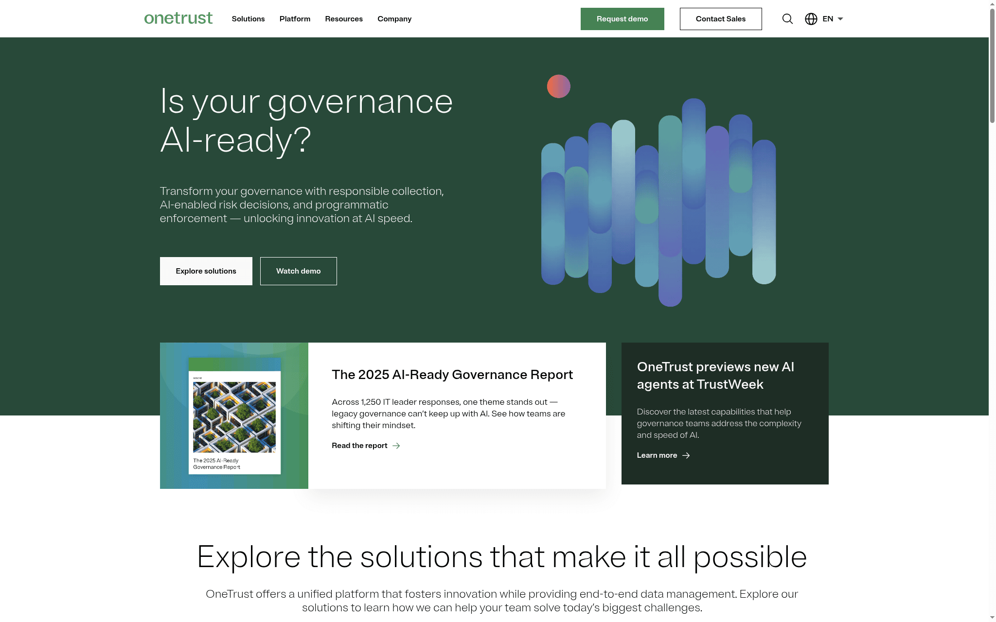 - Comprehensive platform covering multiple governance domains: OneTrust combines AI governance, privacy, consent, and third-party risk in a single product suite so teams avoid fragmented point solutions.