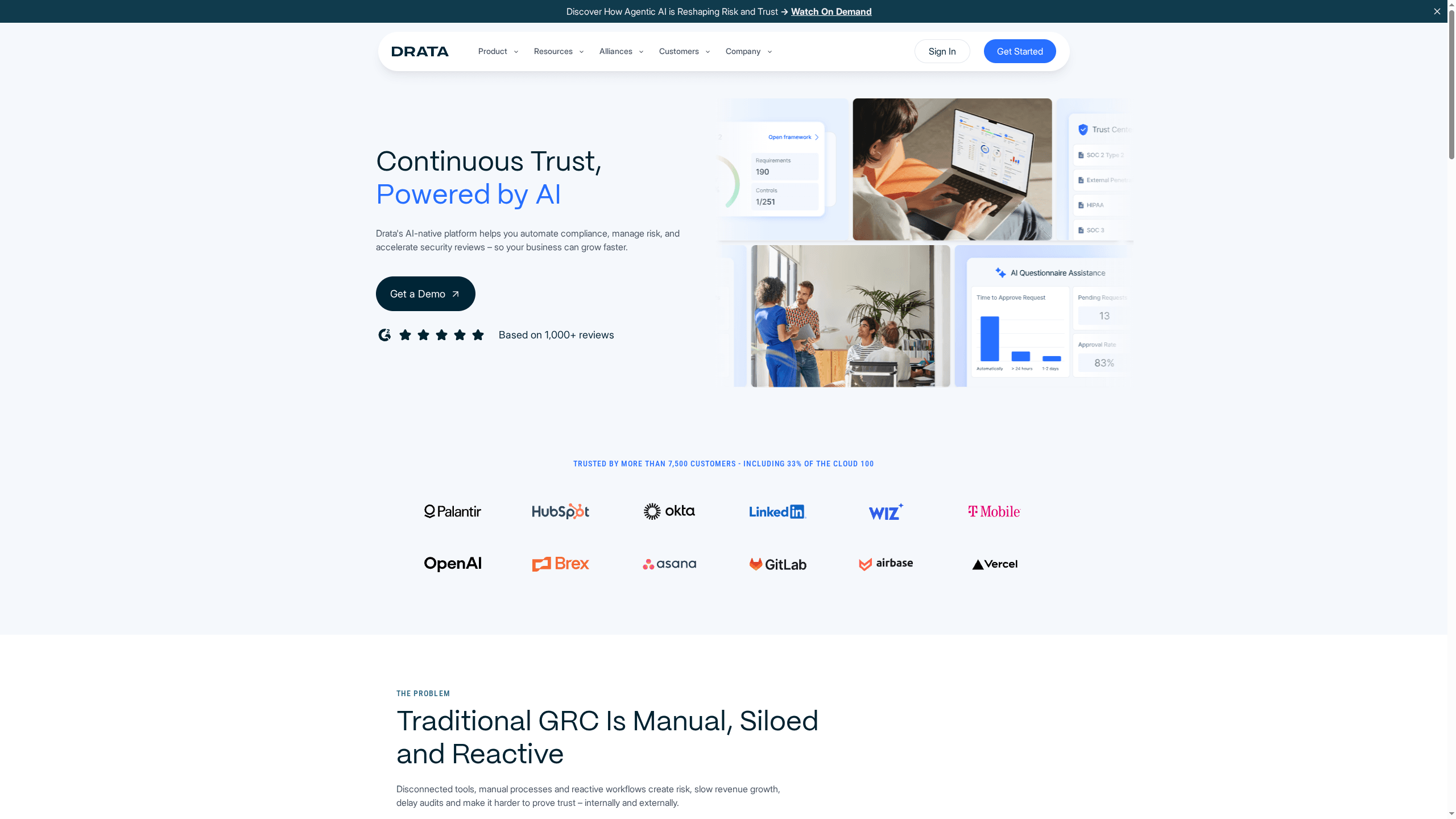 Drata’s unique value proposition lies in combining AI-native automation with continuous monitoring and evidence collection to turn compliance from a periodic, manual burden into a continuous business enabler. The platform is positioned as a single source of truth for trust and audit readiness that reduces friction between security, compliance, and revenue teams.