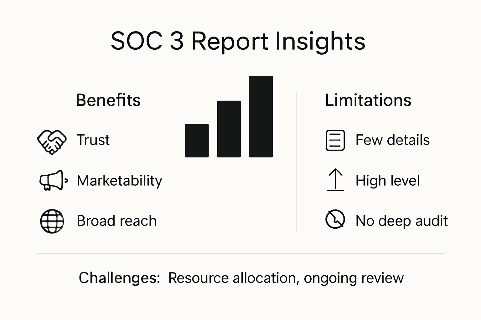 Below is a summary of key benefits and challenges associated with SOC 3 reports:
